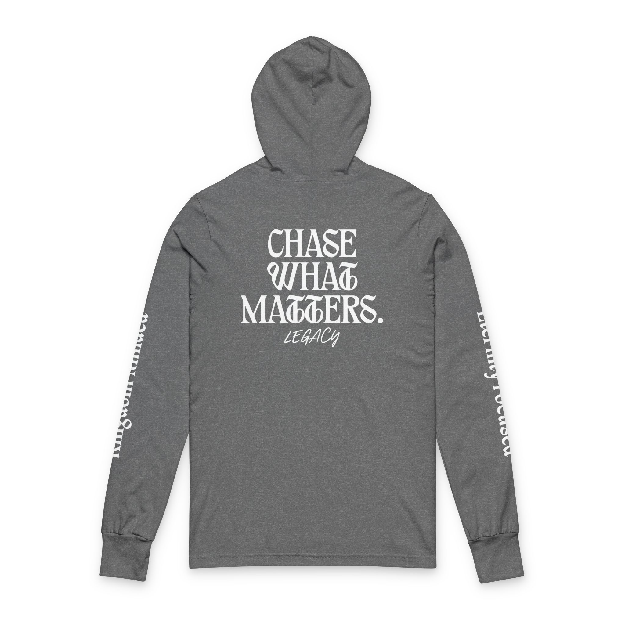 Hooded long-sleeve tee with sleeve text: “Kingdom Minded” and “Eternity Focused.”
